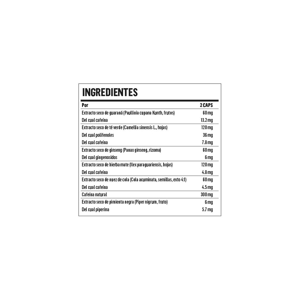 – Cafeína natural procedente del grano de café (Coffea arabica L.), Extracto seco de té verde (Camellia sinensis (L.) Kuntze., hojas), Extracto seco de hierba mate (Ilex paraguariensis A. St.-Hil., hojas), Extracto seco de guaraná (Paullinia cupana Kunth, fruto), Extracto seco de ginseng (Panax ginseng C.A. Mey, rizoma), Extracto seco de nuez de cola (Cola acuminata, semillas, ext. 4:1), Extracto seco de pimienta negra (Piper nigrum L., fruto)-Bioperine®