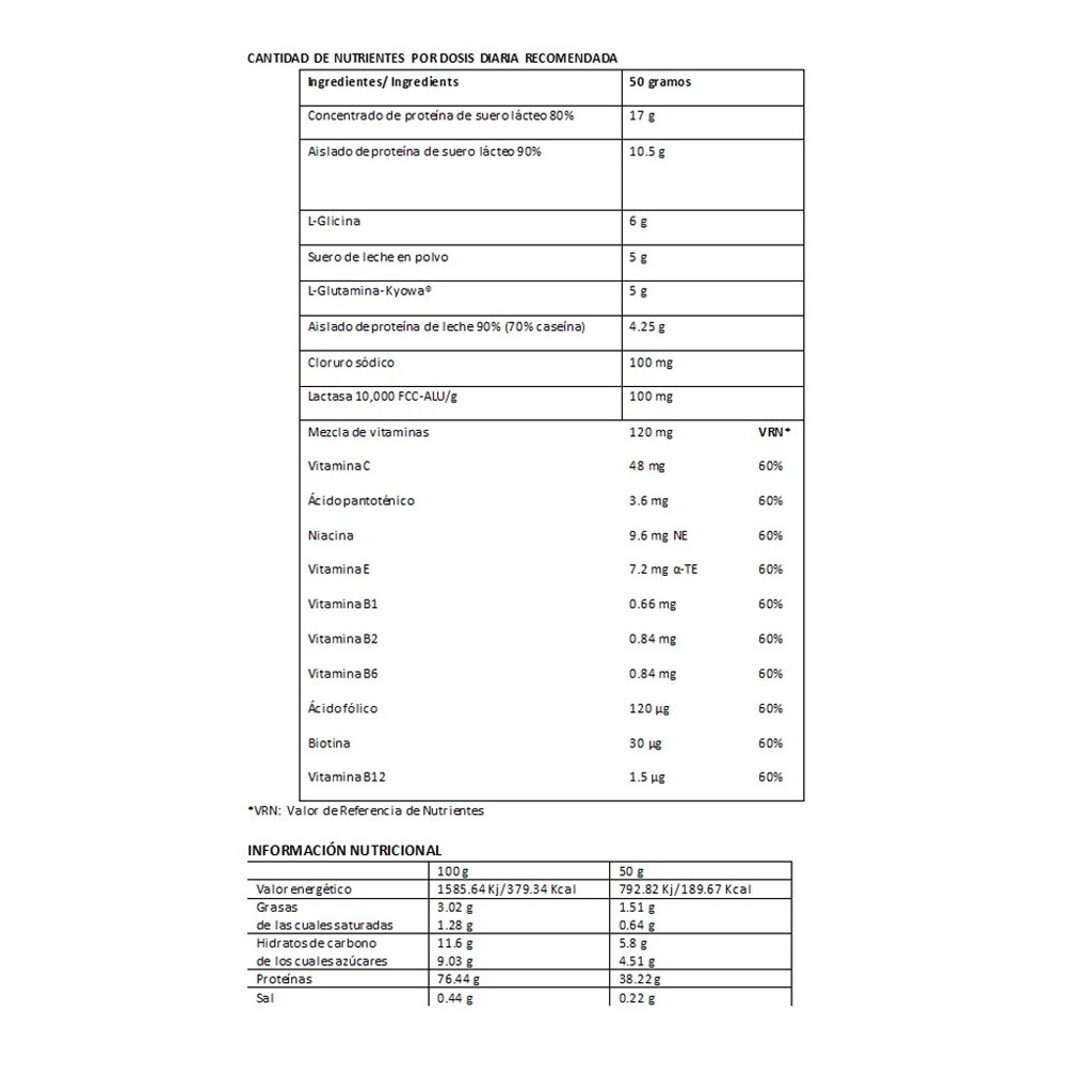 – Concentrado de proteína de suero de LECHE 80% proteína (emulgente (lecitina de SOJA)), Aislado de proteína de suero de LECHE 90% proteína (emulgente (lecitina de SOJA)), L-Glicina, Suero de LECHE en polvo, L-Glutamina-Kyowa®, Aislado de proteína de LECHE 90% proteína (70% caseína), Aroma, Edulcorante (Aspartamo), Mix de vitaminas (Vitamina C (ácido L-ascórbico), maltodextrina, vitamina E (acetato de DL-alfa tocoferilo), niacina (nicotinamida), ácido pantoténico (D-pantotenato cálcico), vitamina B6 (clorhidrato de piridoxina), vitamina B2 (riboflavina), vitamina B1 (clorhidrato de tiamina), vitamina B12 (Cianocobalamina), folato (ácido pteroilmonoglutámico) y biotina (D-biotina)), Cloruro de sodio, Lactasa 10,000 FCC-ALU /g, Edulcorantes (Sucralosa, Acesulfamo K), Aromas.