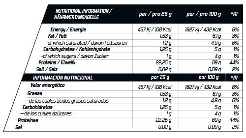 | INGREDIENTES | – Mezcla de proteínas (Aislado de proteína de suero de leche, Hidrolizado de proteína de suero de leche, concentrado de proteína de suero de leche filtrado por flujo cruzado ultra filtrado], aceites vegetales (triglicéridos vegetales de cadena media -MCT- de aceite de coco), Aromas |