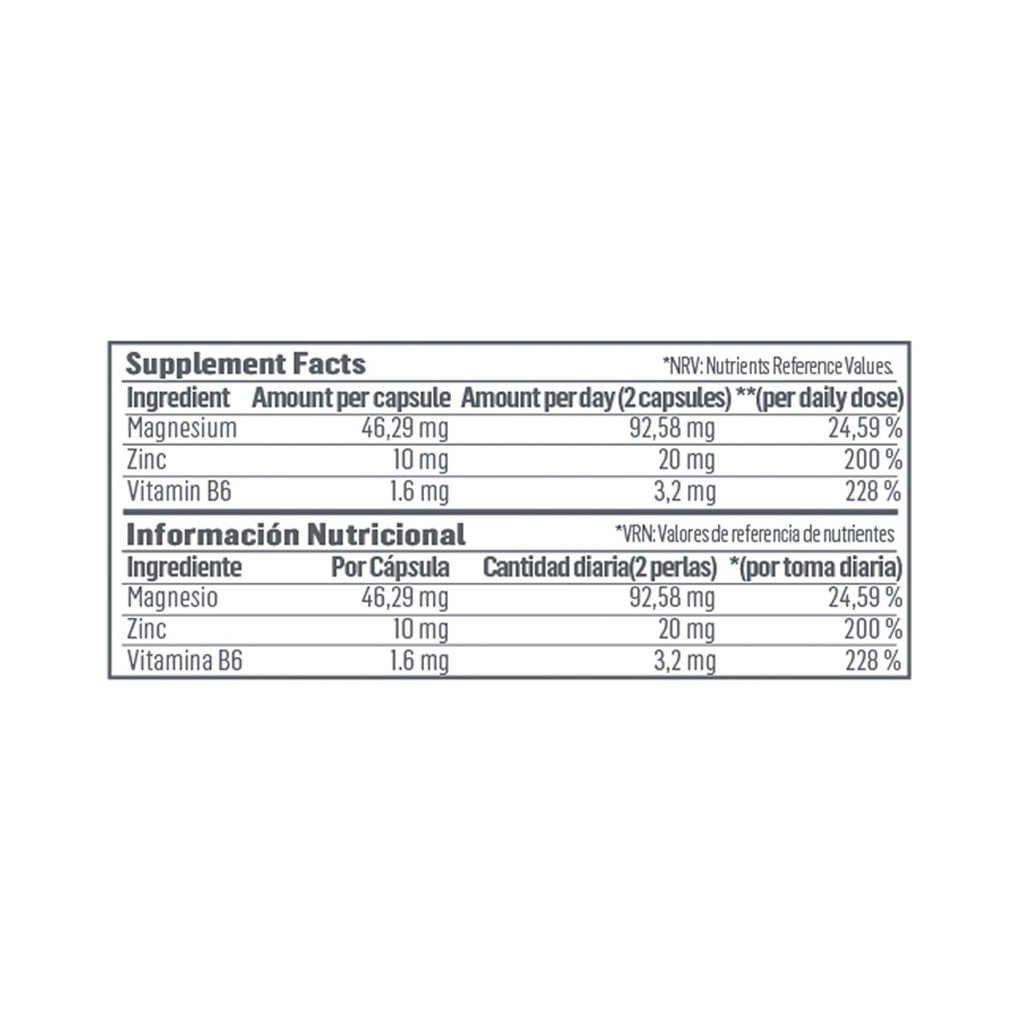 | INGREDIENTES | – Magnesio citrato, Blisglicinato de zinc, Vitamina B6 (Clorhidrato de Piridoxina) |